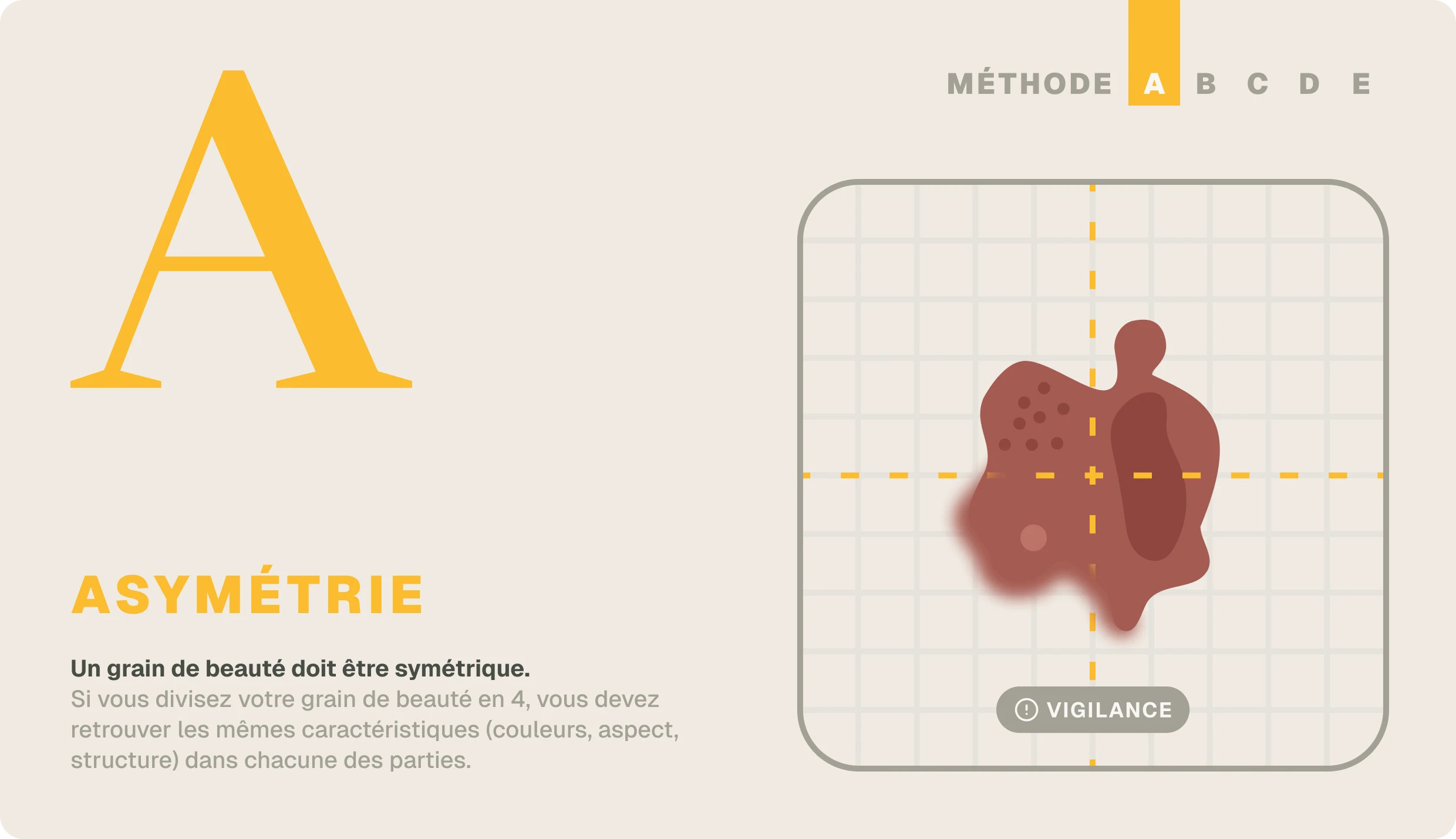 - A comme Asymétrie : Un grain de beauté doit être symétrique. Si vous "coupez en 4" votre grain de beauté, vous devez retrouver les mêmes caractéristiques (couleurs, aspect, structure) dans chacune des parties