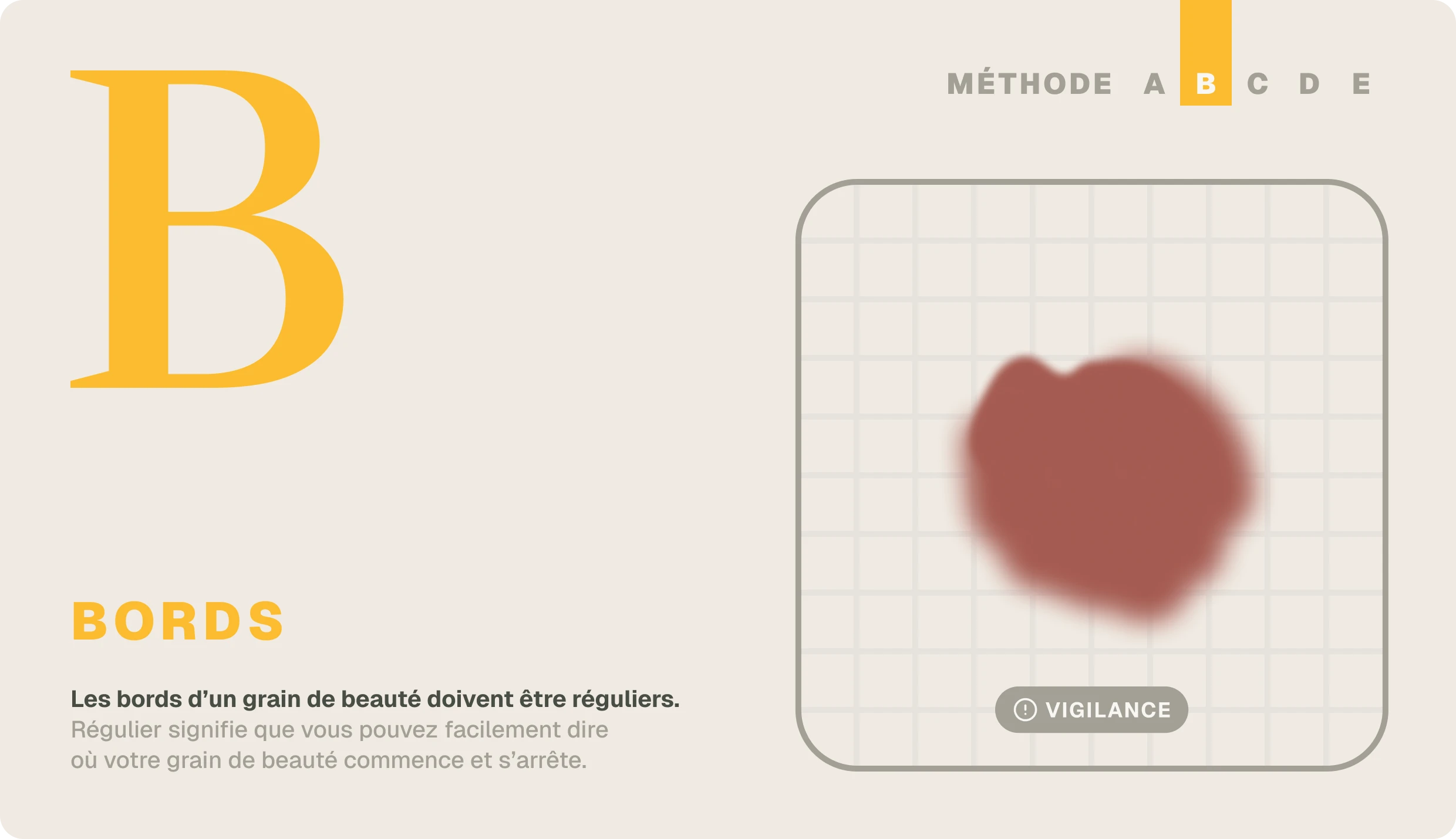 - B comme Bords : Les bords d'un grain de beauté doivent être réguliers. Régulier signifie que vous pouvez facilement dire où votre grain de beauté commence et s'arrête.